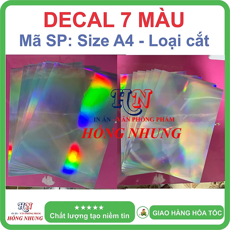 + Tính thẩm mỹ cao: Decal 7 màu sáng bóng, đa sắc màu, phản quang tốt, hình thức đẹp nổi trội hơn. Nhờ đó khi dán lên thành phẩm lấp lánh, dễ thu hút, cũng đồng thời làm nổi bật được các thông tin liên quan về sản phẩm.
