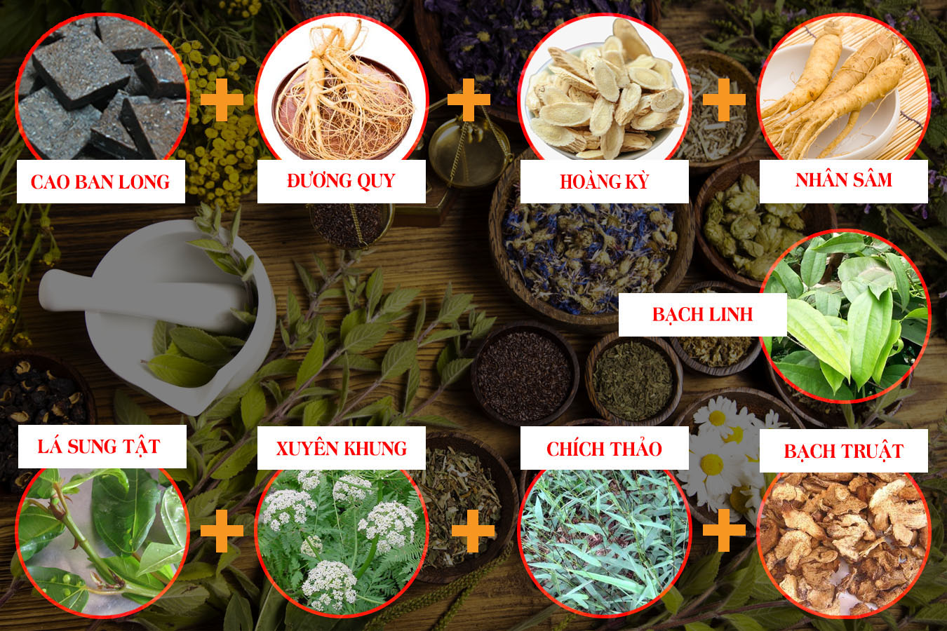 - Đặc biệt vị Cao Ban Long trong Đông Y được xem là “Thánh Dược Bổ Khí Huyết”. Cao Ban Long được bào chế từ sừng, gạc của loài hươu (tự rụng vào cuối mùa hạ). Theo nghiên cứu của các nhà khoa học thì sừng, gạc hươu được hình thành từ tế bào gốc của loài hươu, do đó có sừng hươu tự rụng rồi mọc là do có khả năng tái sinh liên tục. Do đó đây là vị quan trọng trong việc hoạt hóa tế bào gốc giúp hình thành tế bào hồng cầu, là thành phần chính của máu. Bên cạnh Cao Ban Long thì chúng tôi cũng phải kết hợp thêm nhiều vị khác để đạt hiệu quả cao nhất cho bệnh nhân như Nhân Sâm, Đương Quy, Hoàng Kỳ, Bạch Truật, Xuyên Khung, Bạch Linh, Lá Sung Tật, Chích Thảo… và một số vị gia giảm khác.