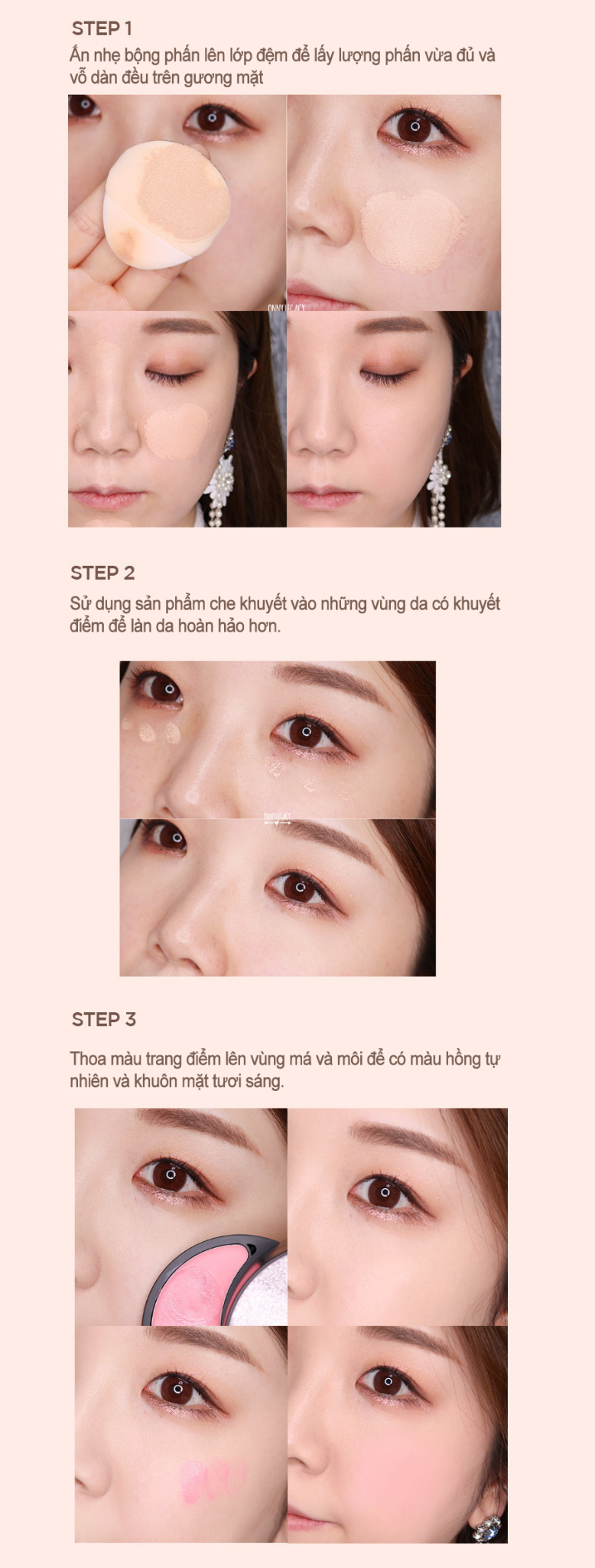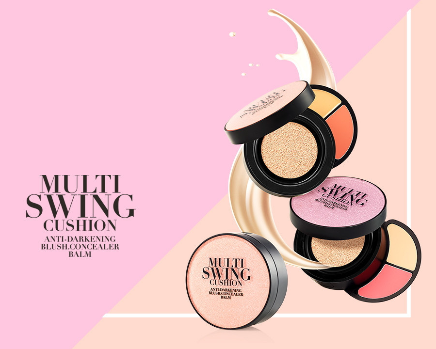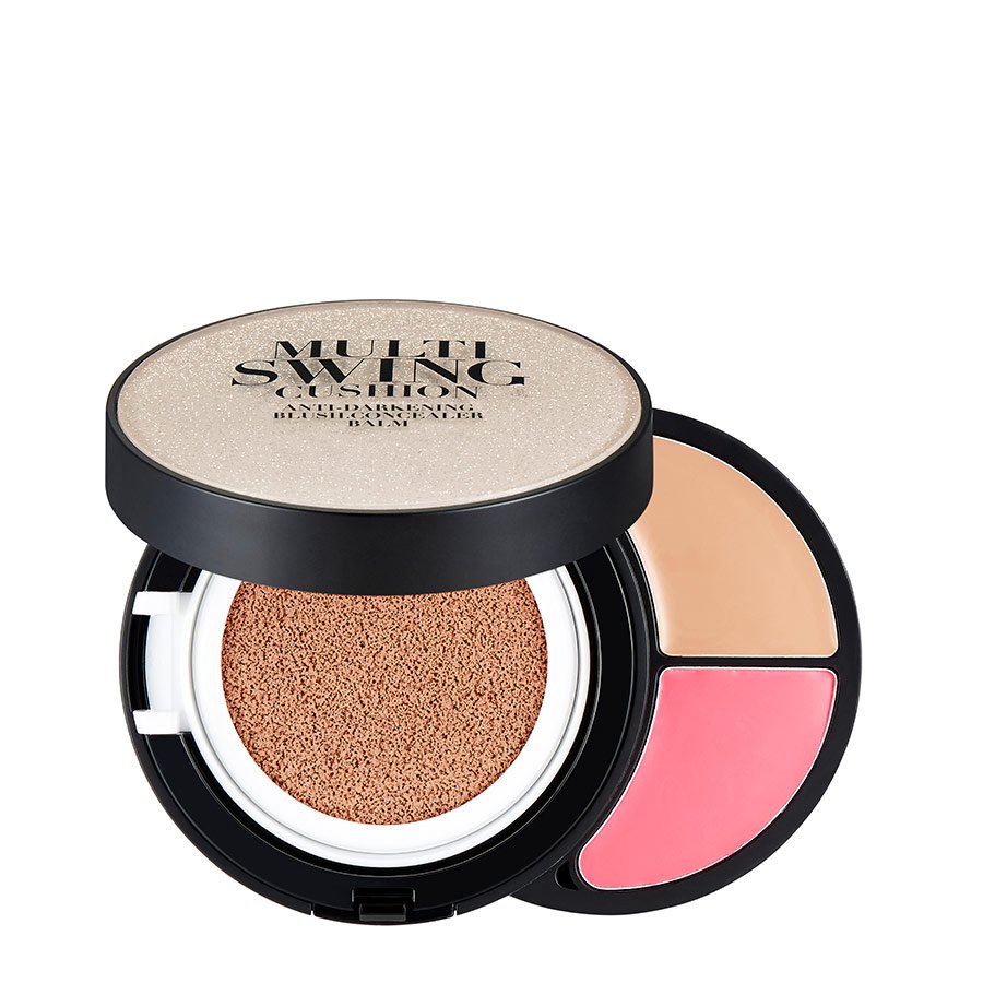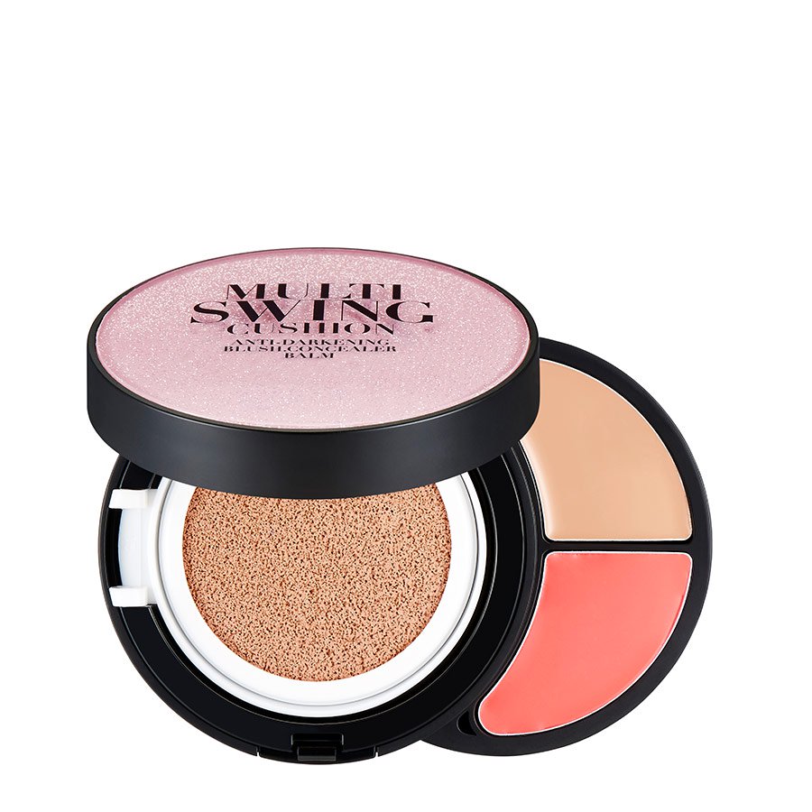 - Sản Phẩm Trang Điểm 3 In 1 Multi Swing Cushion kết hợp 3 sản phẩm trong cùng 1 hộp sản phẩm: Phấn trang điểm đa năng Anti-Darkening Cushion (15g) + Che khuyết điểm Concealer Balm (1.3g) + trang điểm mắt môi Lip & Cheek Balm (1.3g).
