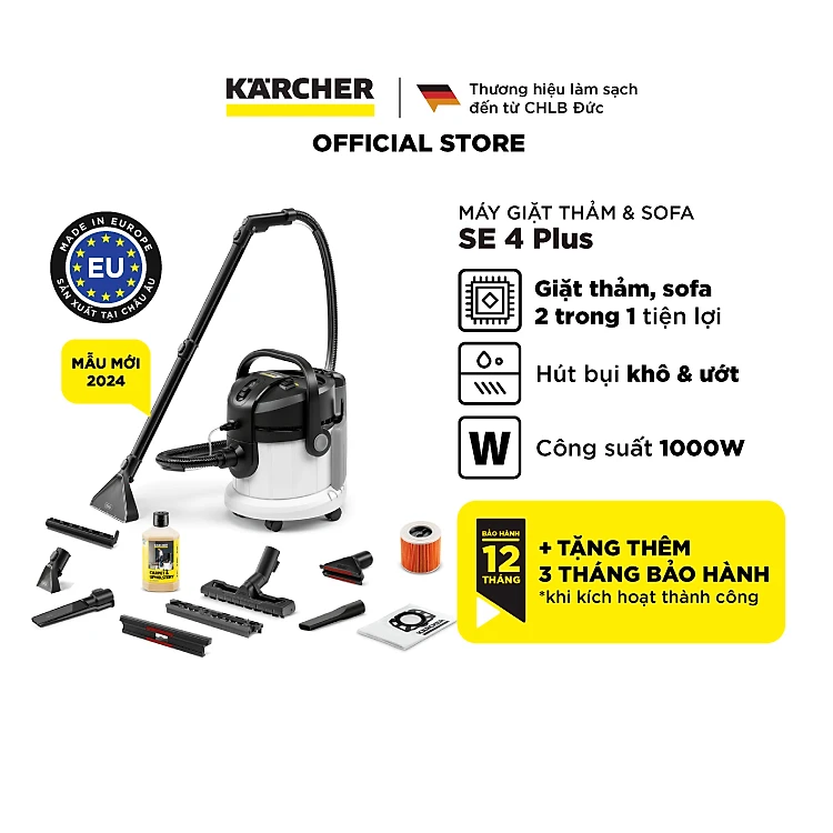(Sản xuất Châu Âu) Máy giặt thảm, Sofa Karcher SE 4 Plus - Công suất 1000W - Làm sạch thảm, sofa và hút bụi đa năng dùng cho gia đình - Hàng Chính Hãng