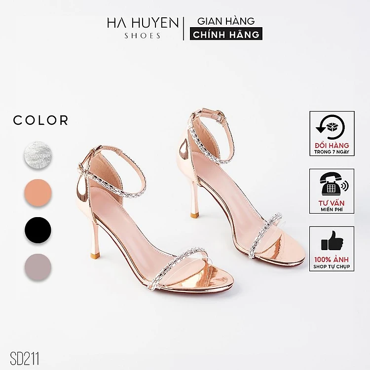 Sandal cao gót nữ Hà Huyền Shoes quai trong phối đá mảnh gót nhọn 8 phân - SD211
