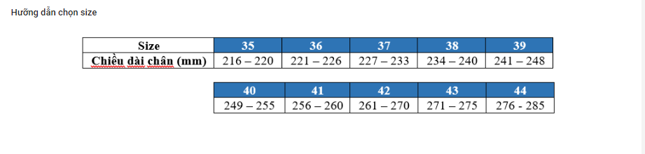 • Sản phẩm có nhiều size cho bạn linh hoạt lựa chọn phù hợp với kích cỡ chân của mình