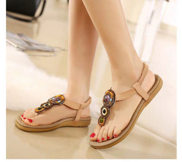 Sandal Đế Bệt Đính Đá Thổ Cẩm được làm từ chất liệu simili mềm mại đi êm chân, đính những hạt đá tính sảo đẹp mắt, màu sắc thổ cẩm.