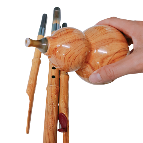 Cách thổi Sáo Bầu Inox Vân Gỗ Tông Đô (Tone C): Ngậm trên đầu nhỏ của quả bầu, đặt tay vào 6 lỗ sáo ở trên và ngón cái ở phía dưới, em hơi và thổi mạnh