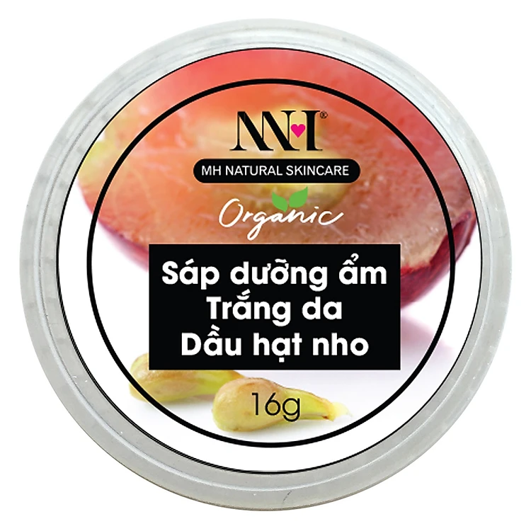 - Sáp Dưỡng Ẩm Trắng Da Chiết Xuất Dầu Hạt Nho MH Natural Skincare 20188 được chiết xuất từ 100% nguyên liệu thiên nhiên có tác dụng dưỡng ẩm, chống nứt nẻ (mùa lạnh), dưỡng trắng da. Dầu hạt nho được đánh giá là một chất tự nhiên có khả năng chống ôxy hóa cực mạnh.