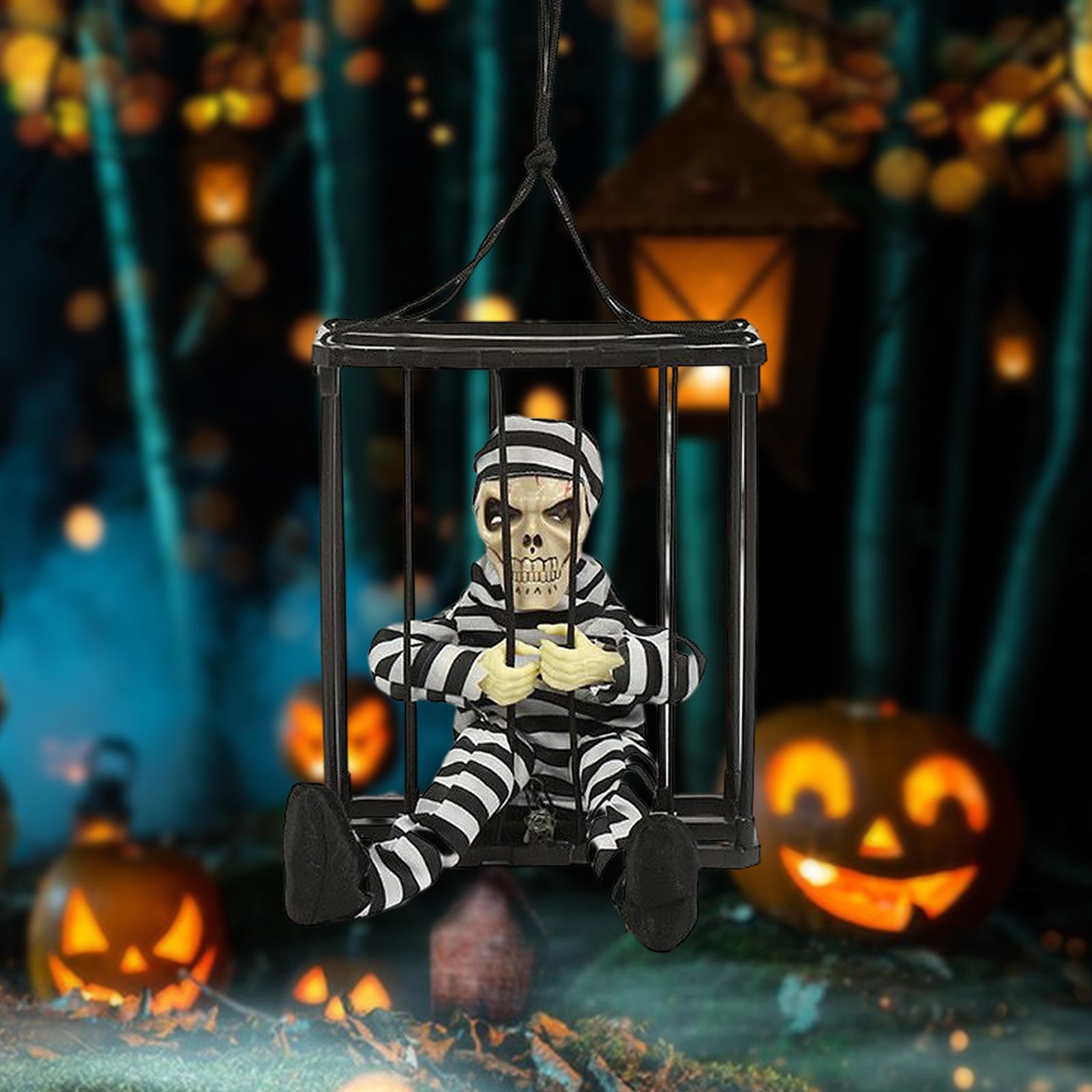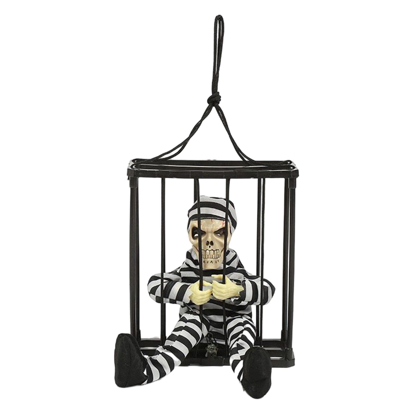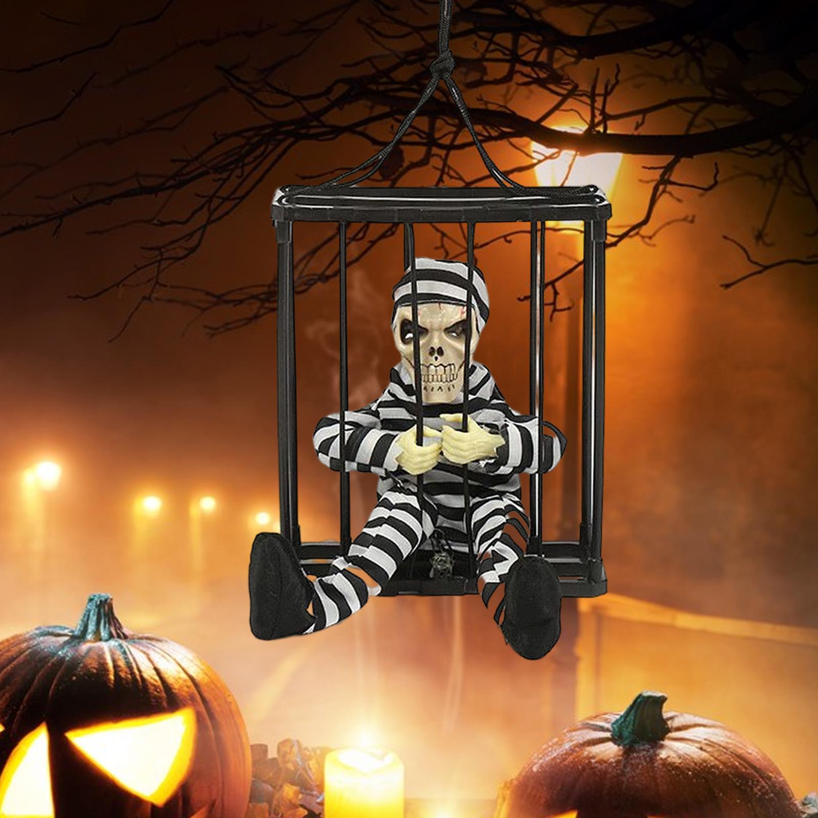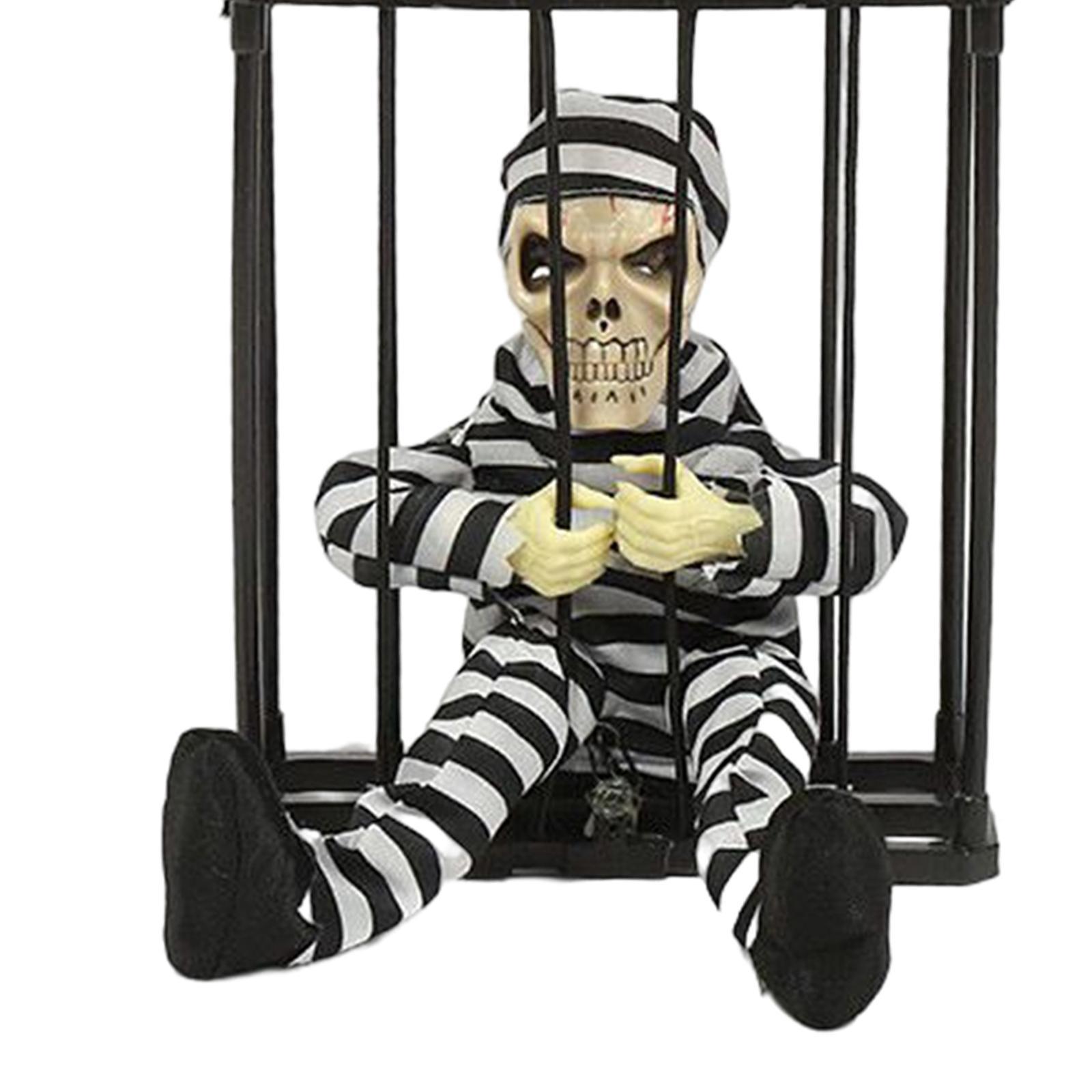 Scary Skull Cage Talking Prisoner: Scary skeleton halloween Specter horror prisoner toy in prison cage, when trigger the animated halloween decor, caged prisoner eyes Glowing Eyes reach his head out while screaming\' \'. Give a spook factor to Halloween decor.