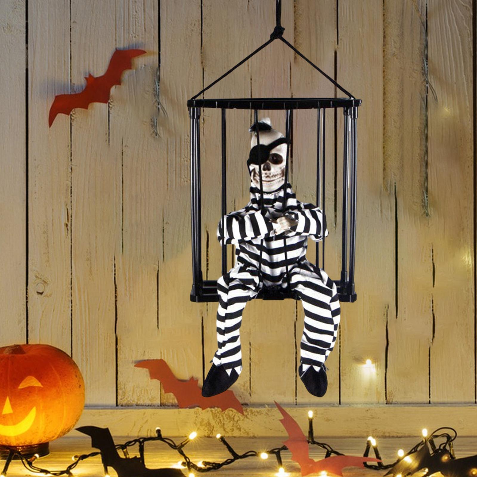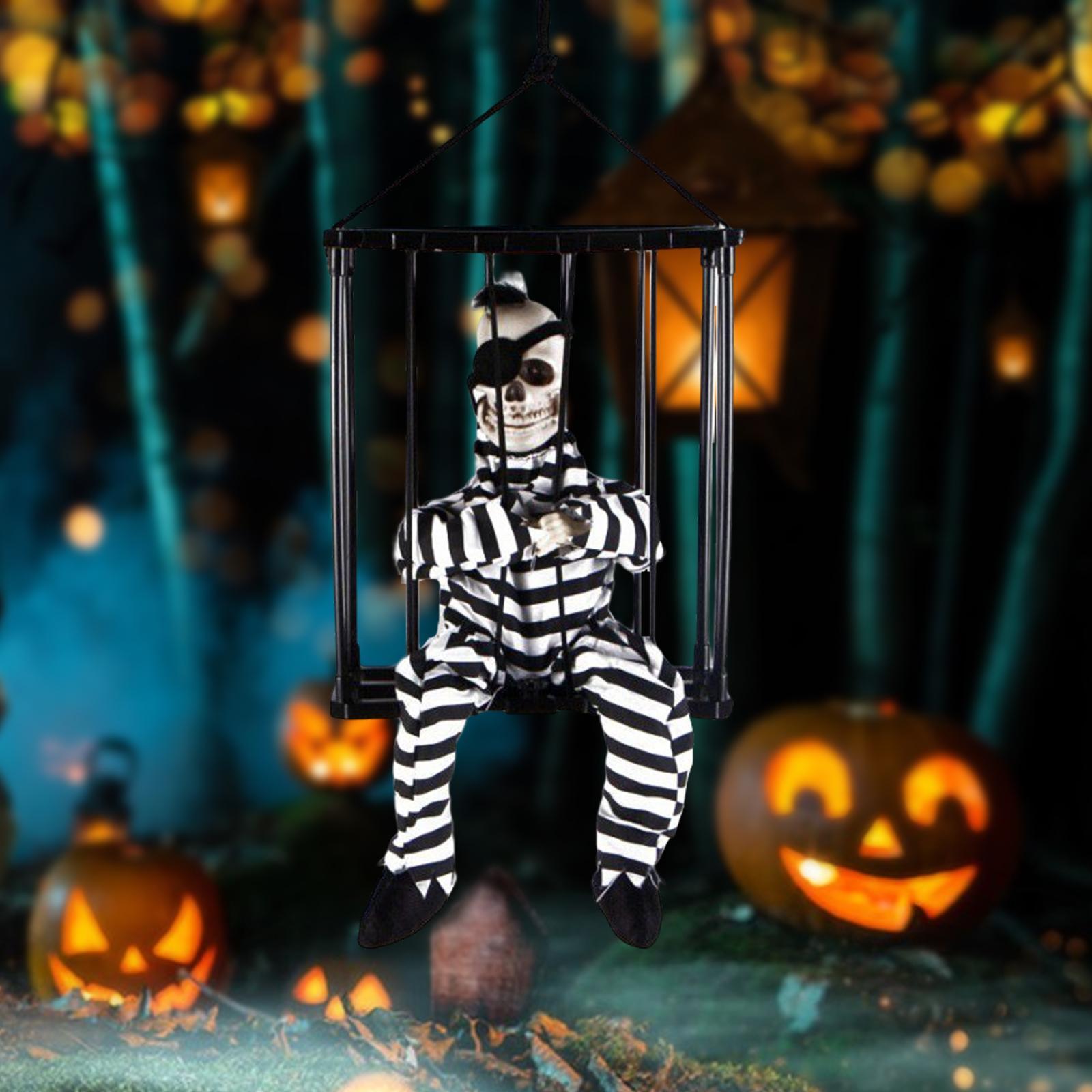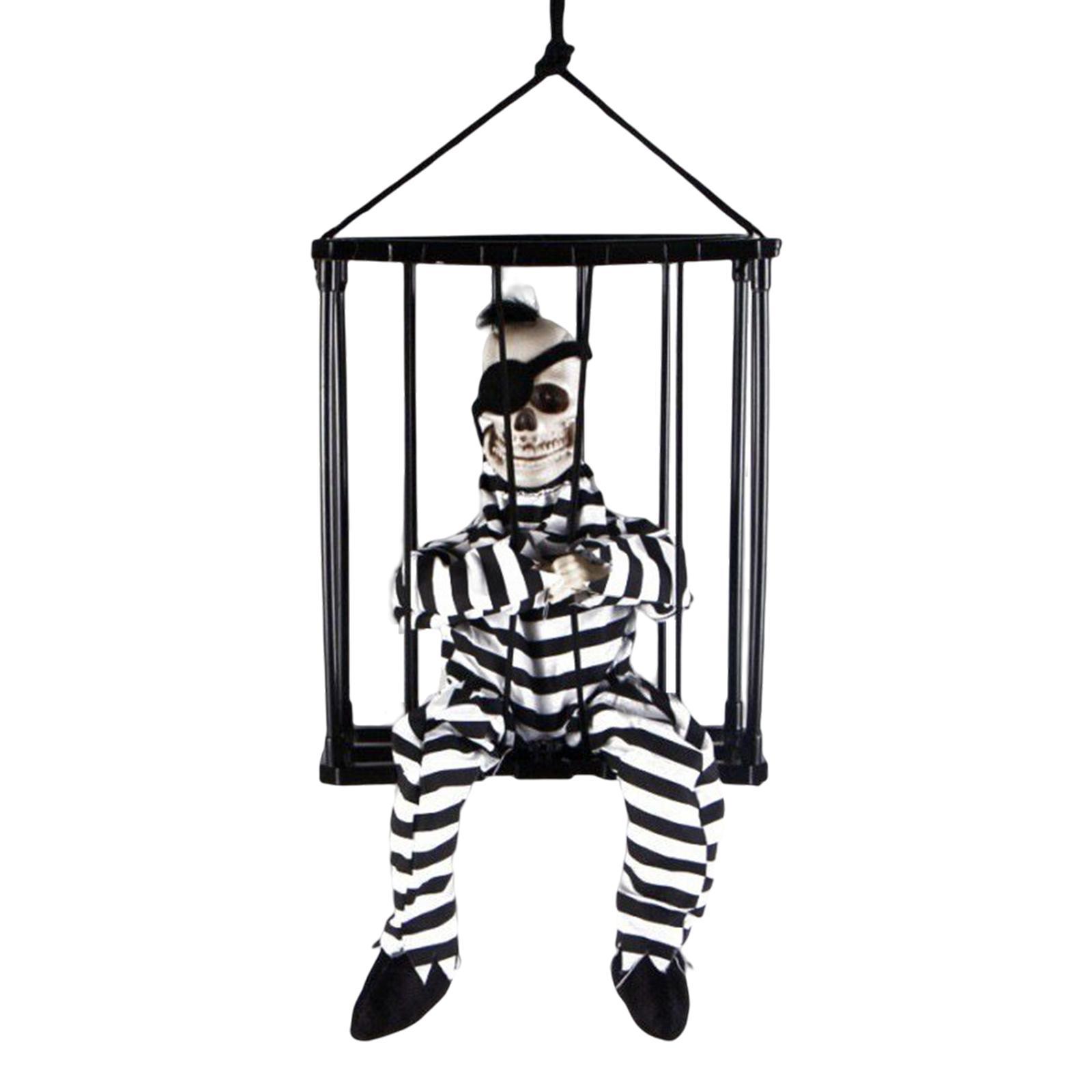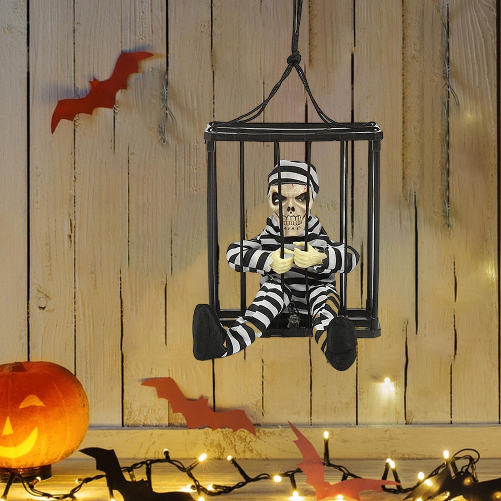 Scary Skull Cage Talking Prisoner: Scary skeleton halloween Specter horror prisoner toy in prison cage, when trigger the animated halloween decor, caged prisoner eyes Glowing Eyes reach his head out while screaming\' \'. Give a spook factor to Halloween decor.