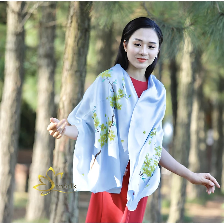SenSilk Hand Drawing Silk Scarves - Tơ Lụa Bảo Lộc Vẽ Hoa Mai 180x55cm, Choàng Cổ Lụa Thời Trang Cho Phái Đẹp
