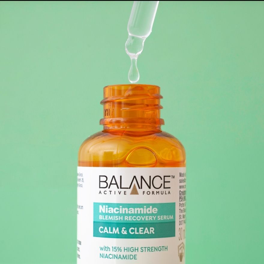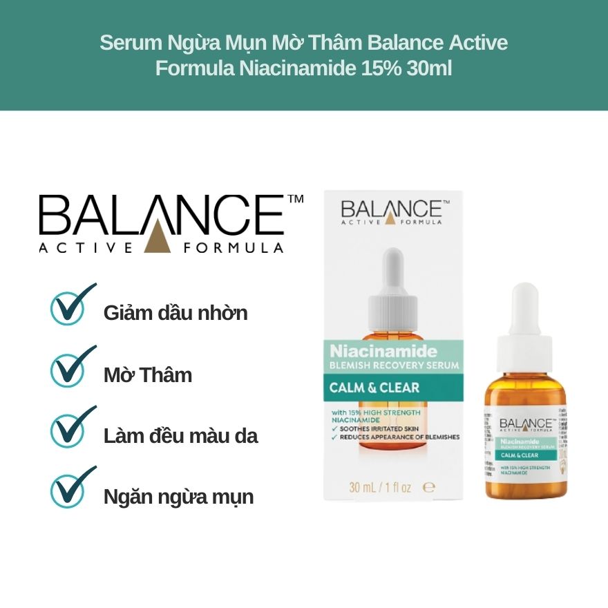 - Tinh chất ngăn mụn mờ thâm Balance Active Formula Niacinamide Blemish Recovery Serum là một loại tinh chất nhẹ dạng nước với 15% Niacinamide - một loại Vitamin B3 tự nhiên giúp giảm dầu thừa, giúp lỗ chân lông được thu nhỏ lại.