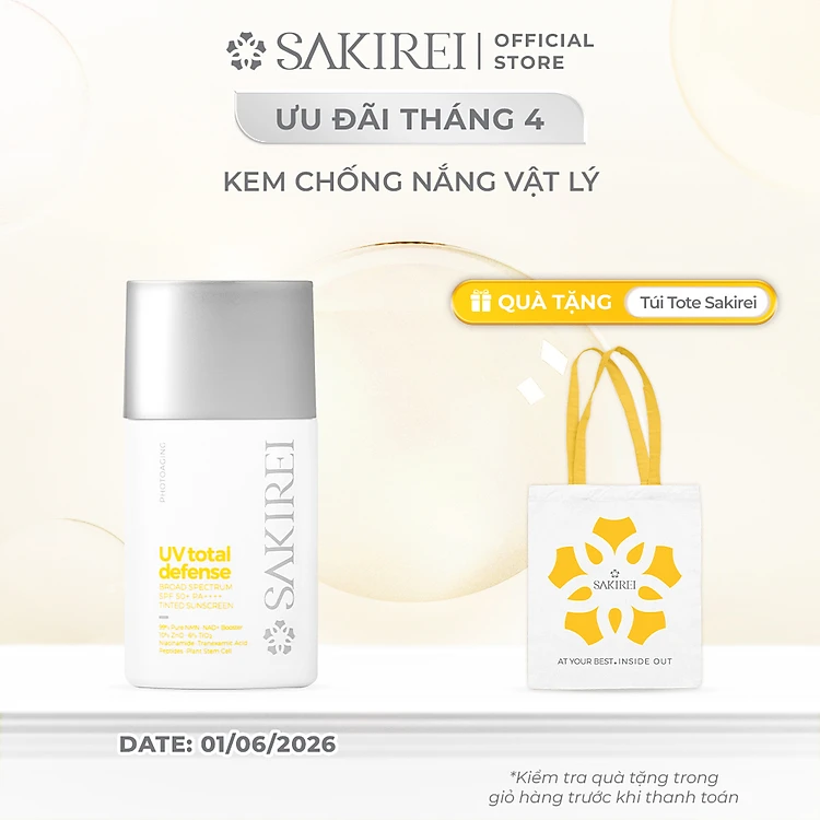 Chống nắng vật lý làm sáng mịn da Sakirei UV Total Defense Broad Spectrum SPF 50+ PA++++ Tinted Sunscreen