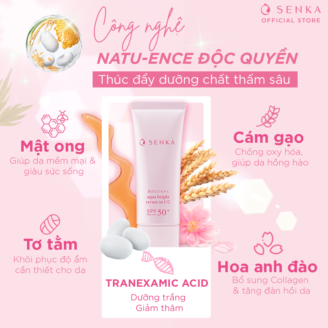 Serum dưỡng trắng da chống nắng Senka 3 trong 1 Senka Aqua Bright Serum in CC 40g được thiết kế theo công nghệ Nhật Bản dưới dạng kem serum, dễ dàng thẩm thấu sâu và mang lại hiệu quả cao trong việc chăm sóc da. CC Serum Senka là sự lựa chọn lý tưởng với 3 tính năng chỉ trong một bước chăm sóc như chống nắng, che khuyết điểm và dưỡng trắng. Sau khi dùng CC serum, làn da sẽ trở nên trắng hồng, giảm thiểu các vết thâm nám, sạm, tàn nhang. Sản phẩm an toàn cho mọi làn da, không gây kích ứng.