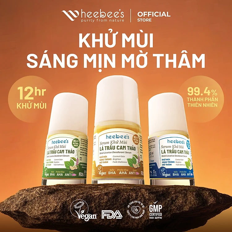 Serum Khử Mùi Thảo Dược Thuần Chay Lá Trầu Cam Thảo Heebee’s Lăn Khử Mùi, Dưỡng Sáng, Mờ Thâm, Ngăn Mùi 12H 30ml