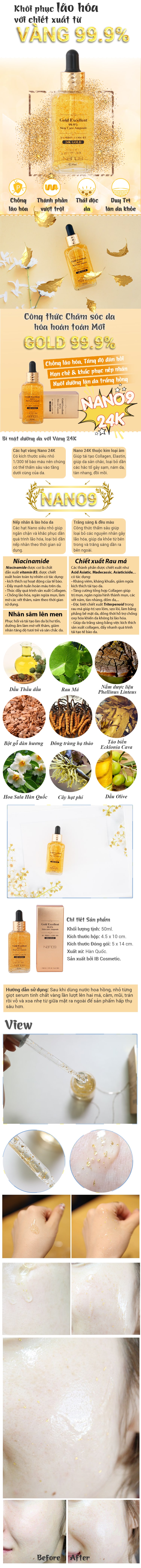 - Serum Tinh Chất Vàng 24k NANO9 Gold Excellent 99% Skin Care Ampoule (50ml) chứa tinh chất vàng 24k tinh khiết, khi sử dụng nhanh chóng đi sâu vào các lớp biểu bì, thúc đẩy sự tổng hợp sợi Collagen, Elastin, khôi phục độ co dãn của mô tế bào, ngăn chặn quá trình lão hóa da, cấp ẩm và duy trì độ ẩm, giúp da trở nên săn chắc hơn nhờ kết hợp với các vitamin A, E… từ các chiết xuất thảo dược thiên nhiên.