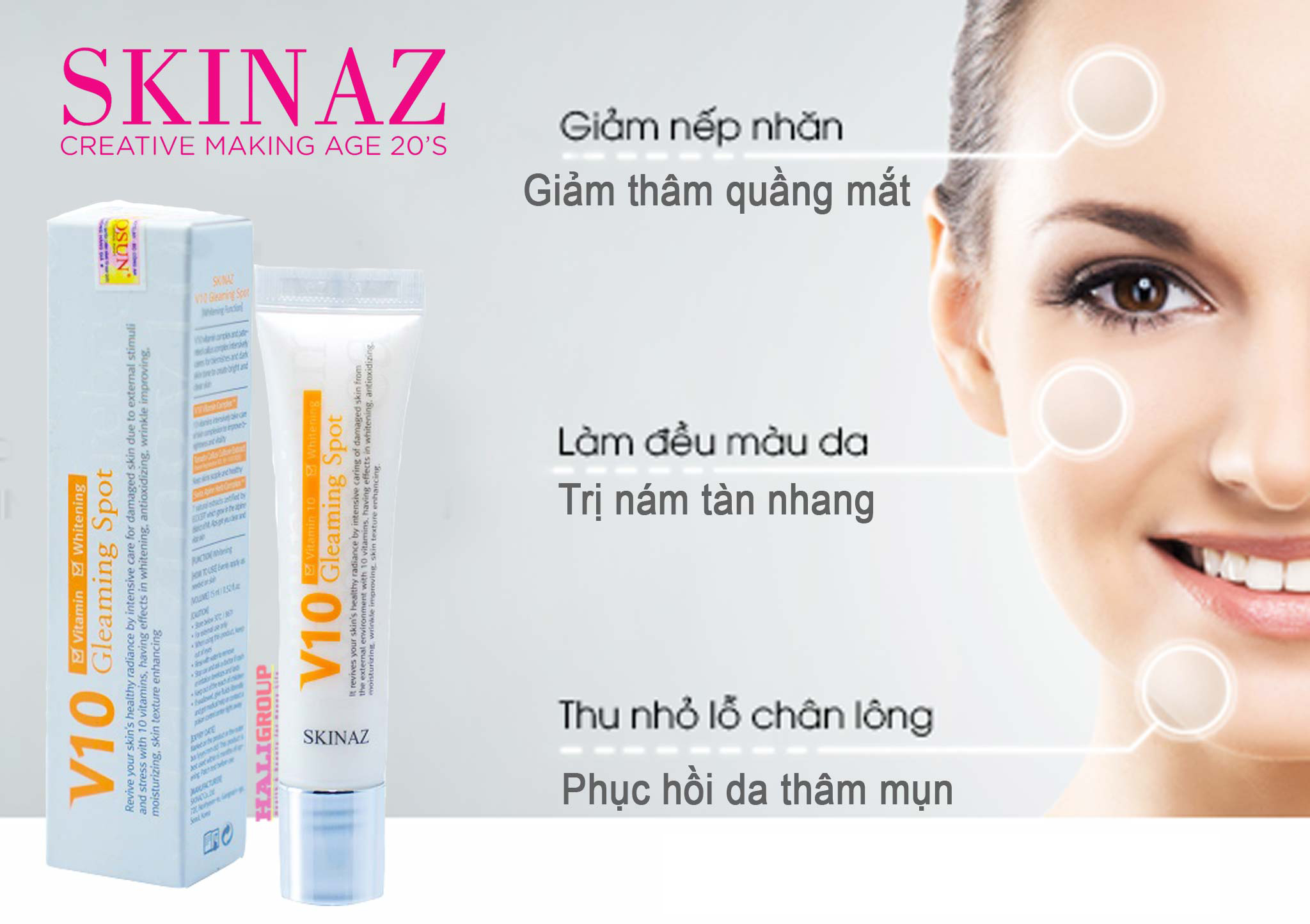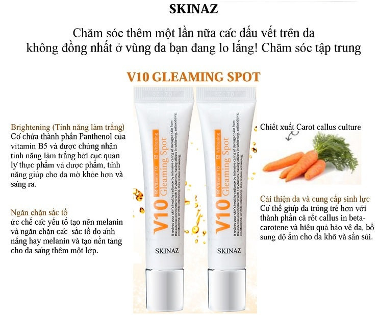 V10 GLEAMING SPOT SKINAZ HÀN QUỐC chính là lời giải đem lại làn da trắng sáng đều màu, xoá bỏ những vết đen li ti xấu xí.