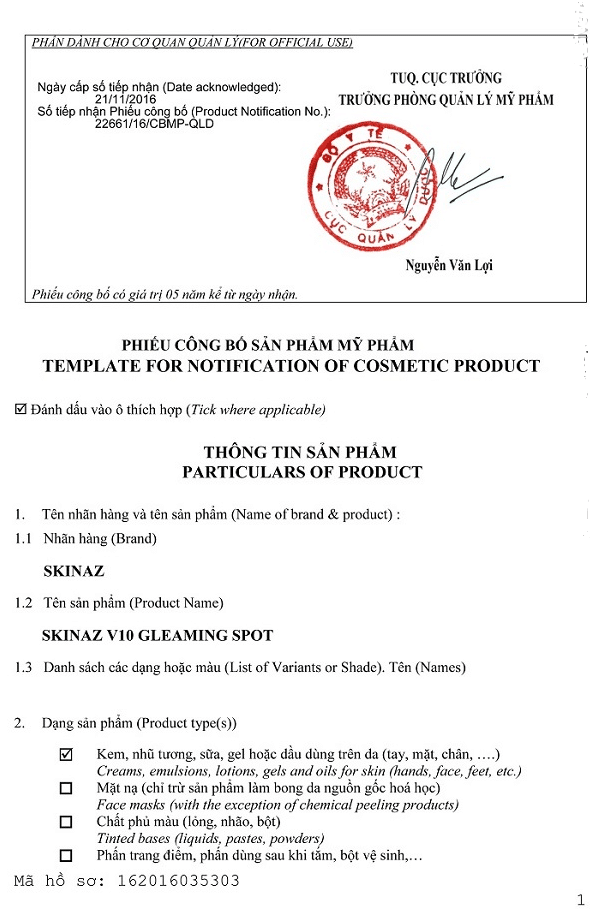 Giấy công bố của Bộ Y Tế về sản phẩm Serum nám V10 Gleaming Spot Skinaz