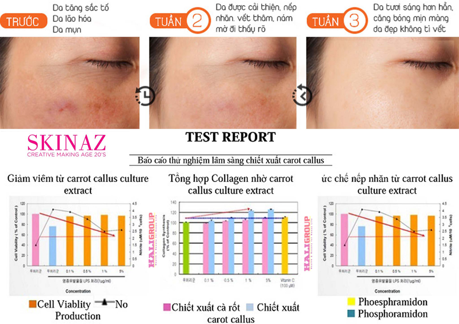 – Chiết xuất Cà rốt: cải thiện da và cung cấp sinh sực. Có thể giúp da trông trẻ hơn với thành phần cà rốt callus in beta – carotene và hiệu quả bảo vệ da, bổ sung độ ẩm cho da khô và da sần sùi.