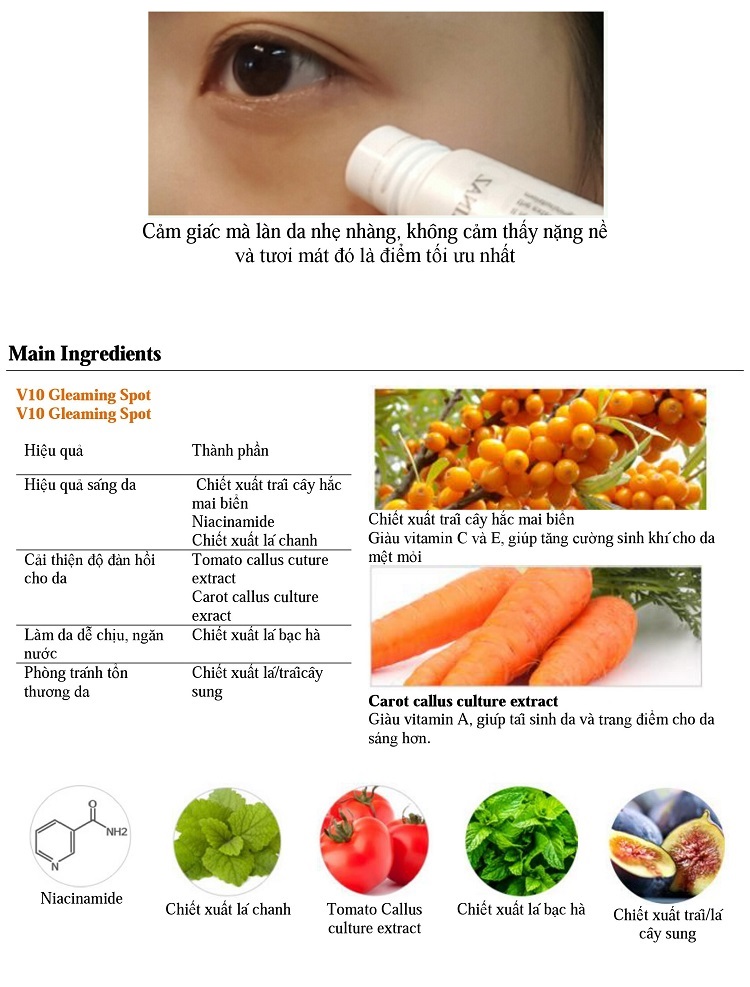 Cùng nhiều tinh chất kết hợp…đem lại làn da tươi sáng, đều màu, xóa mờ vết nám, tàn nhang, đồi mồi và cả quầng thâm quanh mắt cũng được xóa bỏ.