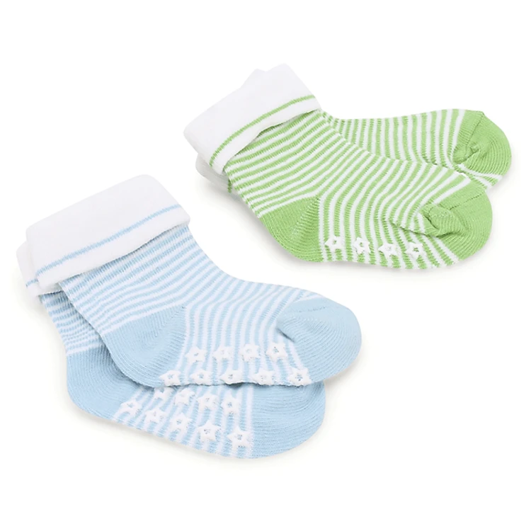 Sản phẩm là bộ 2 đôi có họa tiết sọc ngang với sự phối màu hài hòa giữa xanh dương và trắng, xanh lá và trắng mang lại nét đáng yêu, ngộ nghĩnh cho bé. Sản phẩm được tạo điểm nhấn với hình hoa đẹp mắt.