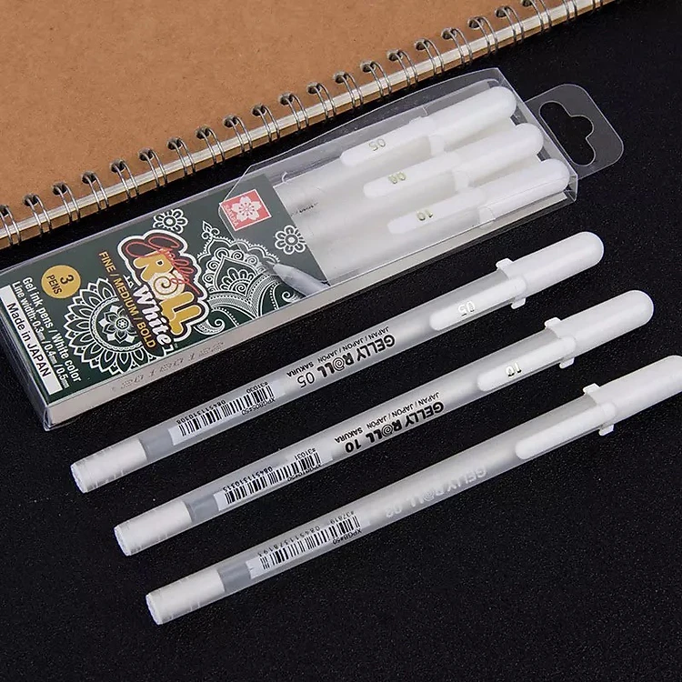 • Set 3 bút gel trắng Gelly Roll ngòi 05, 08, 10 sử dụng loại mực không thấm nước, ổn định, không phai, có thể vẽ trên các bề mặt tối màu.