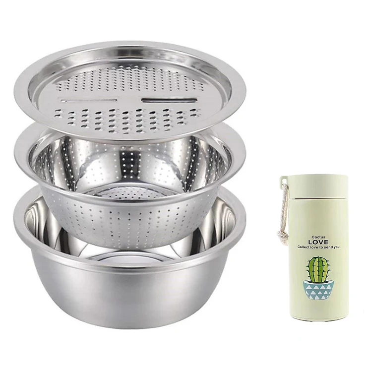 set 3 chậu rổ nạo inox tặng kèm kình giữ nhiệt xương rồng cao cấp