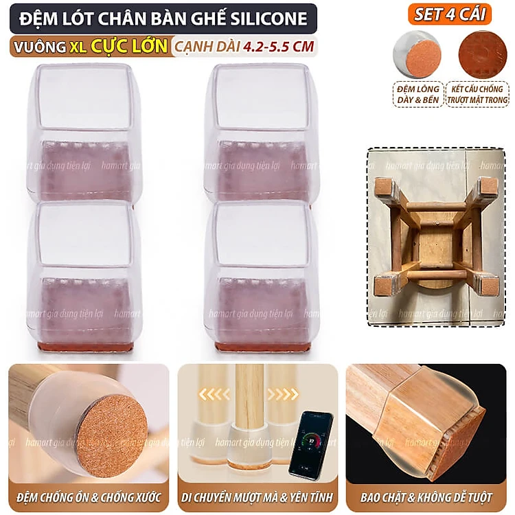 SET 4 Đệm Lót Chân Bàn Ghế Vuông Tròn Chống Ồn Hamart Bọc Chân Ghế Gỗ Silicone Chống Xước Sàn Nhà