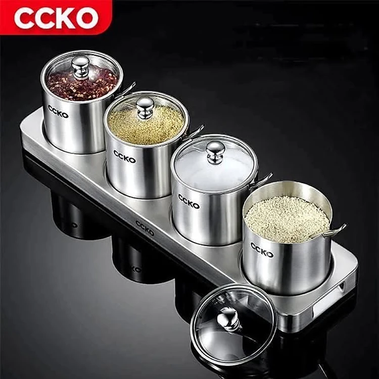 Set 4 hũ đựng gia vị CCKO inox 304 nắp thủy tinh kèm khay Hàng chính hãng