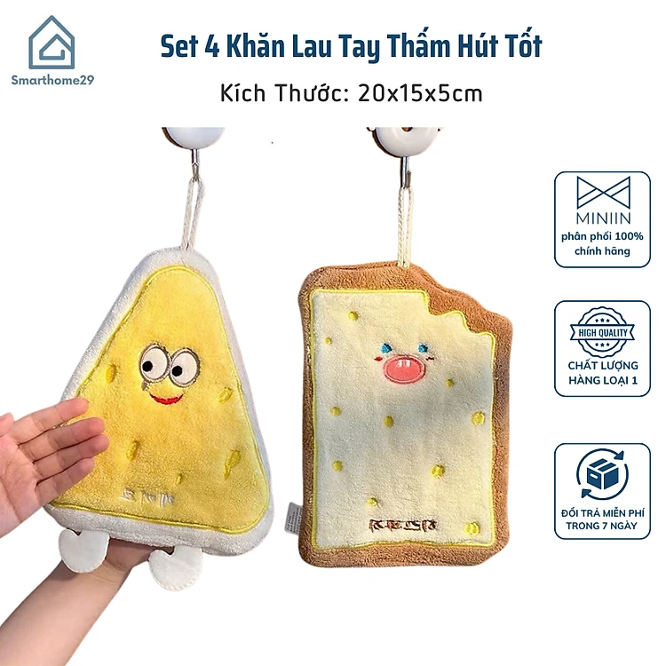 Set 4 Khăn Lau Tay Thấm Hút Tốt Họa Tiết Bánh Mỳ Phô Mai Cute - Khăn Mềm Mịn, Thấm Hút Tuyệt Vời - HÀNG CHÍNH HÃNG MINIIN