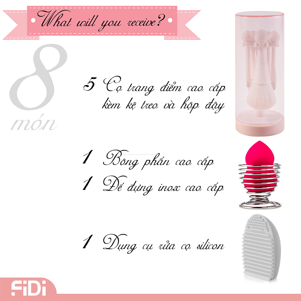 Cọ phủ phấn: có thiết kế lông cọ bung xòe, tán rộng, tròn và mềm. Chấm cọ vào phấn và gõ nhẹ để lượng phấn thừa rơi bớt. Tán phấn đều lên da theo những nét khối tự nhiên của khuôn mặt.