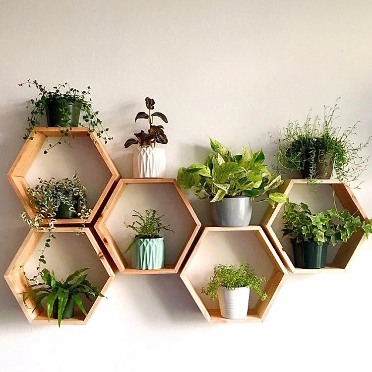 set 5 kệ lục giác treo tường trang trí gỗ thông tự nhiên