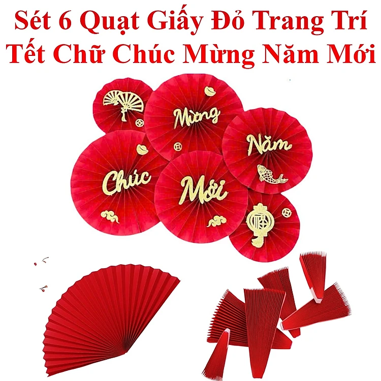 Sét 6 Quạt Giấy Đỏ Trang Trí Tết Chữ Chúc Mừng Năm Mới
