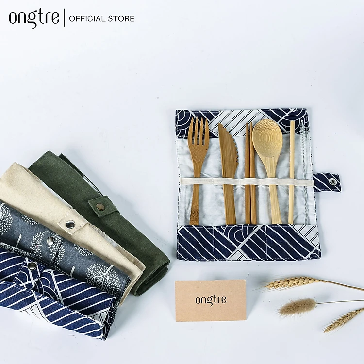 Set 7 món Tre (dao, muỗng, nĩa, đũa, cọ rửa, túi vải) du lịch tiện lợi (Bamboo Travel Utensil Pouch) | ongtre (Vietnam)