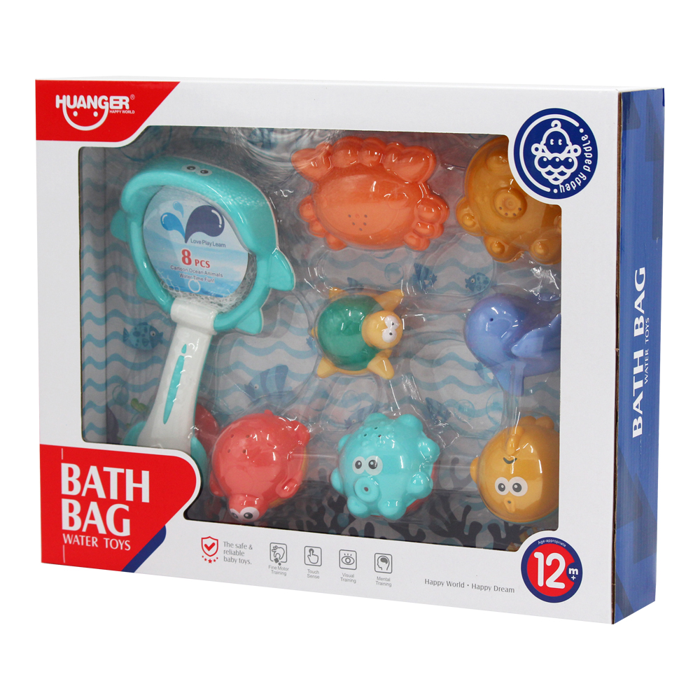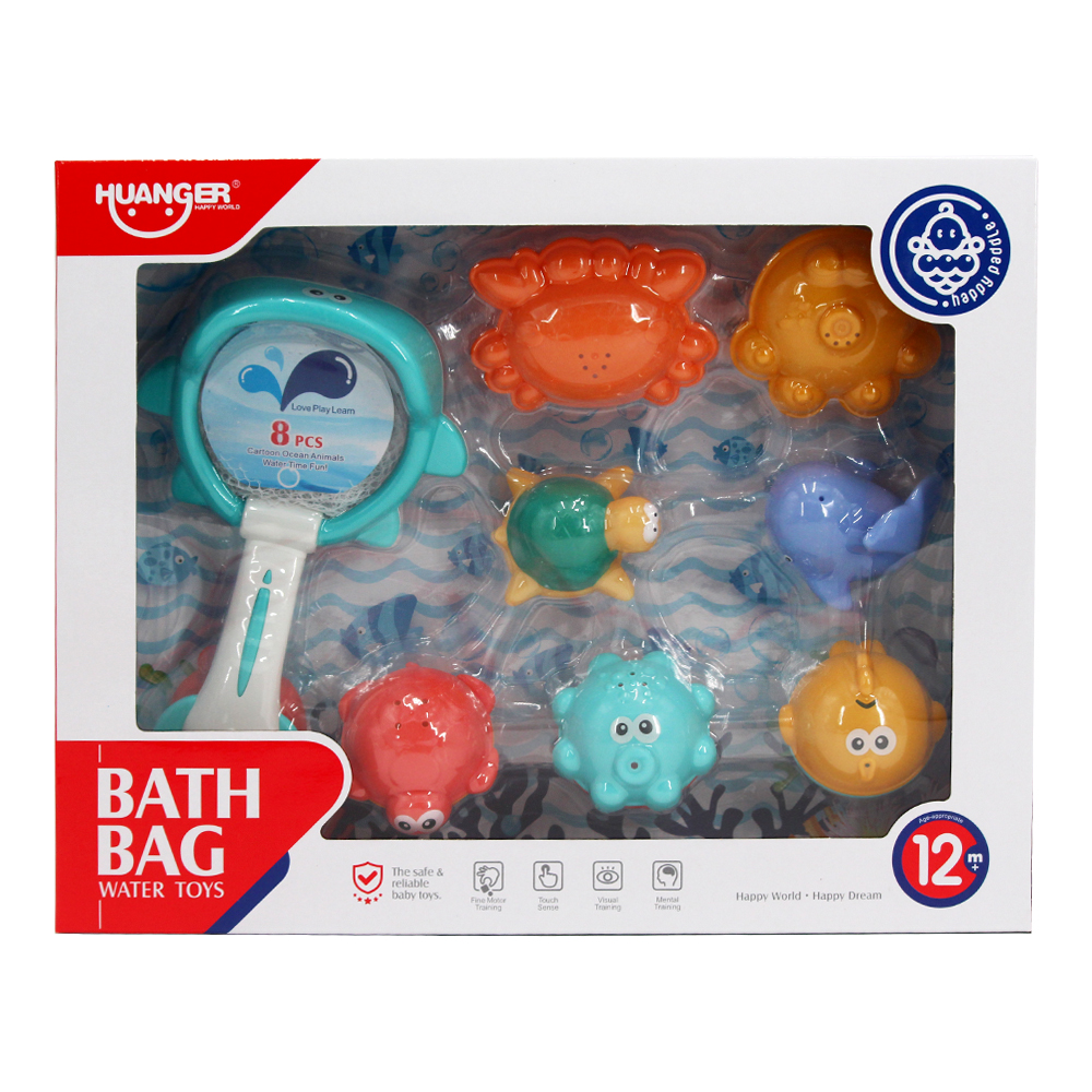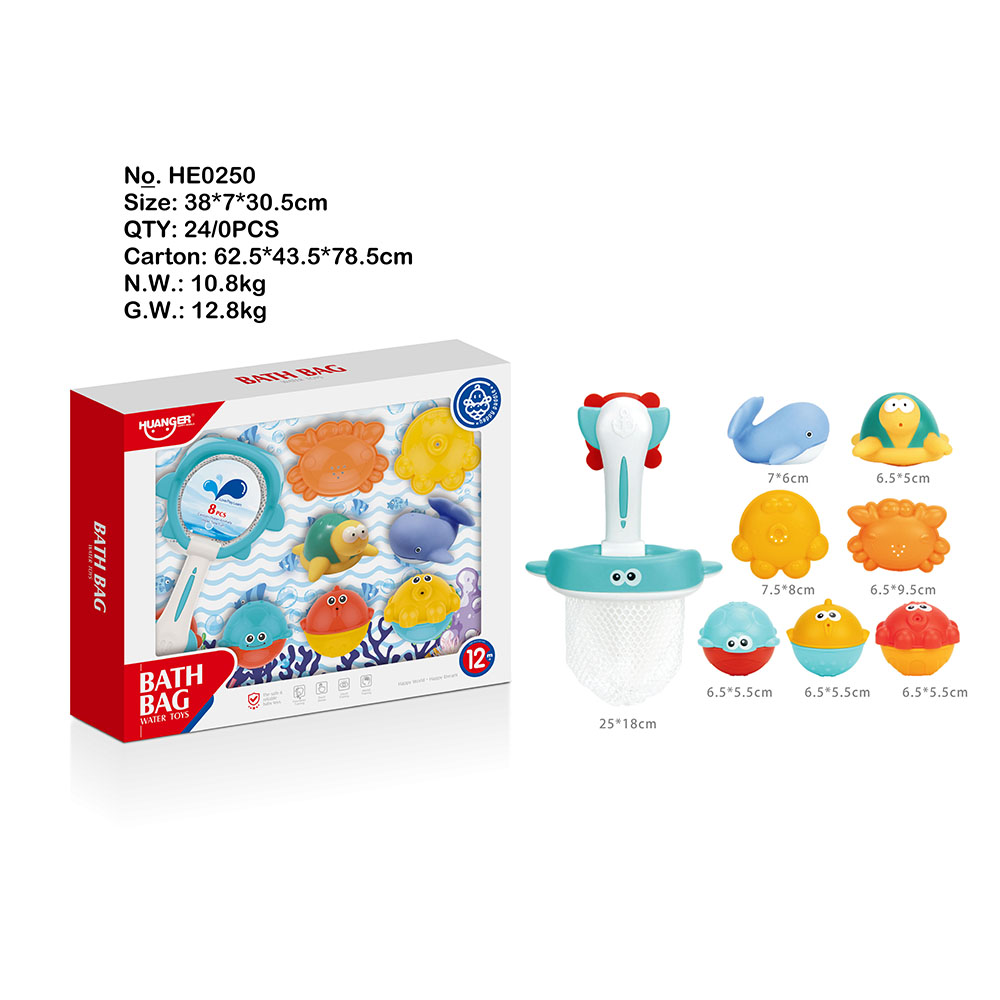 Set 8 món đồ chơi nhà tắm Huanger HE0250 gồm 8 món đồ chơi hình sinh vật biển, vợt bắt cá. Là dạng đồ chơi giáo dục, kích thích sự phát triển nhận thức và các giác quan của bé trong những giai đoạn đầu đời