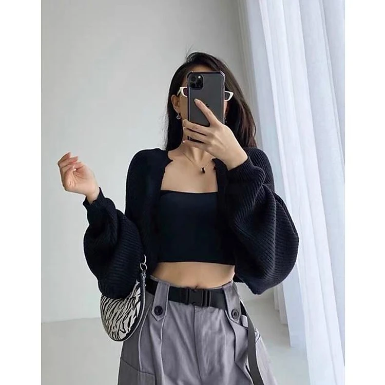 - Set hai món gồm áo khoác cardigan croptop tay bo phồng cùng áo hai dây siêu hot