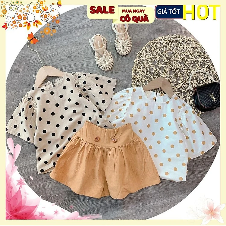 SÉT ÁO CHẤM BI TAY BỒNG QUẦN NÂU CHO BG