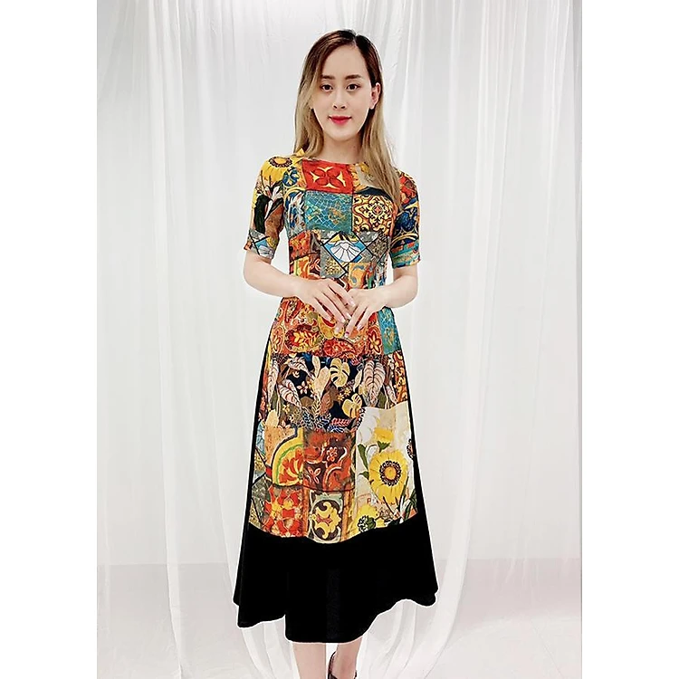 - Kiểu dáng: Áo dài cách tân được thiết kế cổ tròn thuyền, được in 3D hình hoa và lá rực rỡ rất đẹp, không phai màu khi giặt, mực in không độc hại tới sức khỏe, vải mềm mịn đẹp