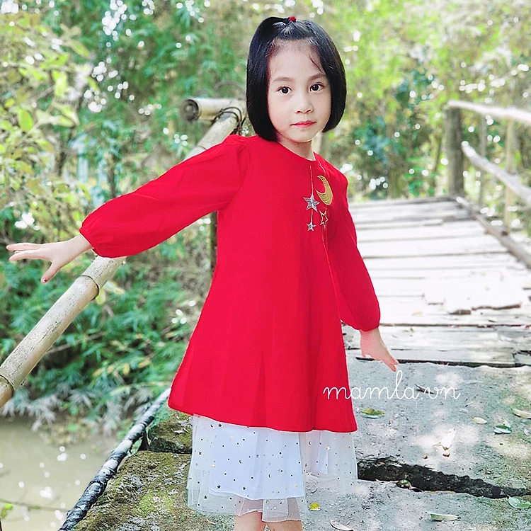 Set áo dài cho bé trai kèm quần bé gái kèm váy Beemo thêu trăng sao màu đỏ Tết MamLa
