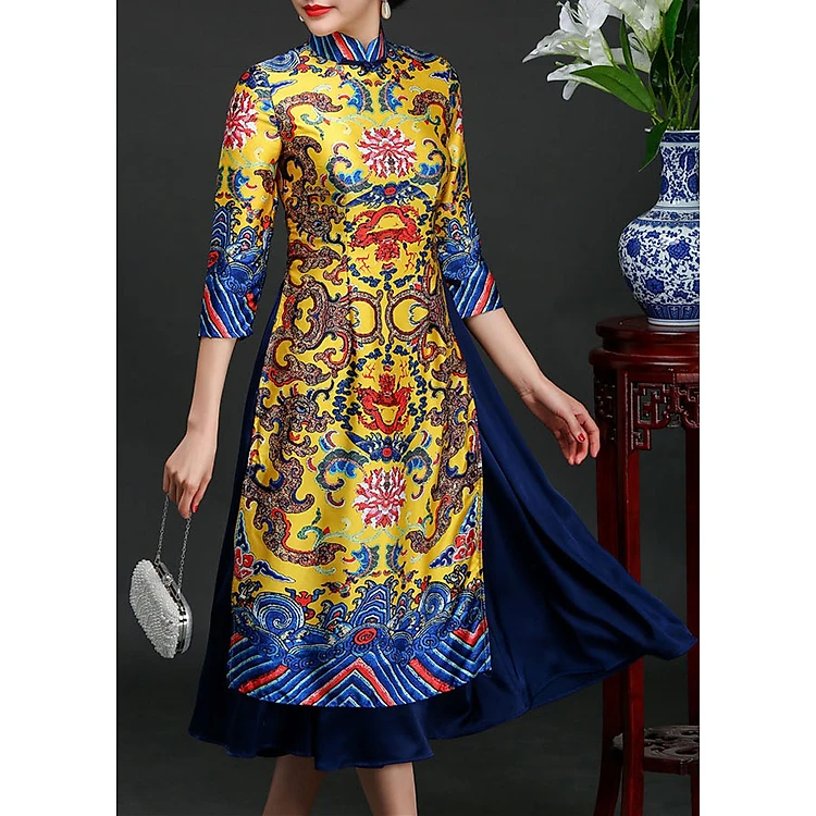 Set Áo Dài Long Bào Xanh Cao Cấp - Vàng