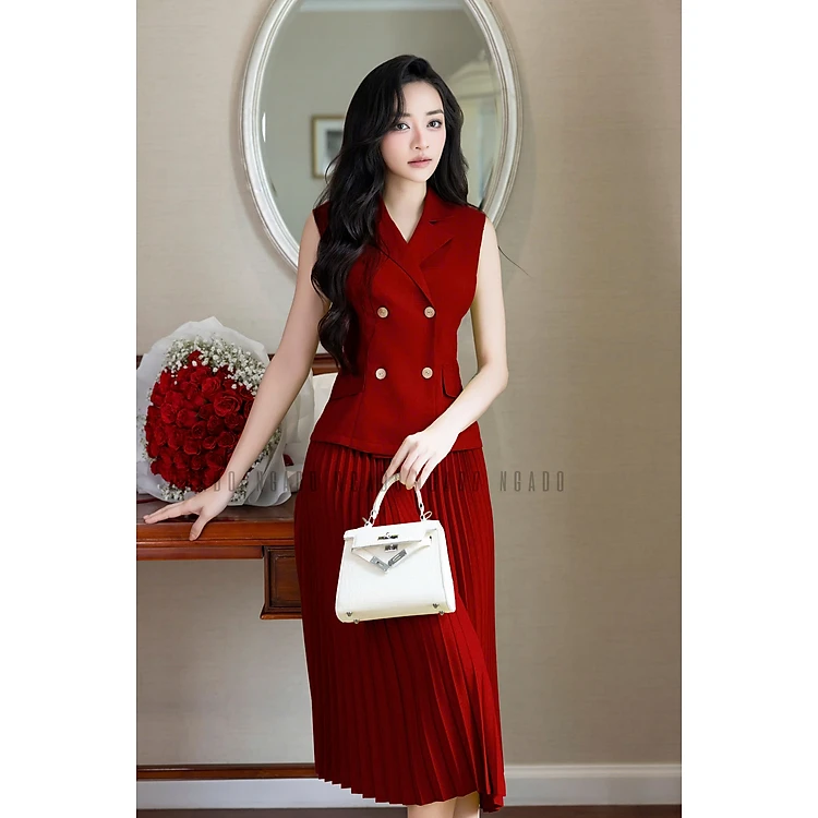 Set áo đỏ chân váy dập ly NGADO , set áo váy dài , set Nữ , set dự tiệc , công sở