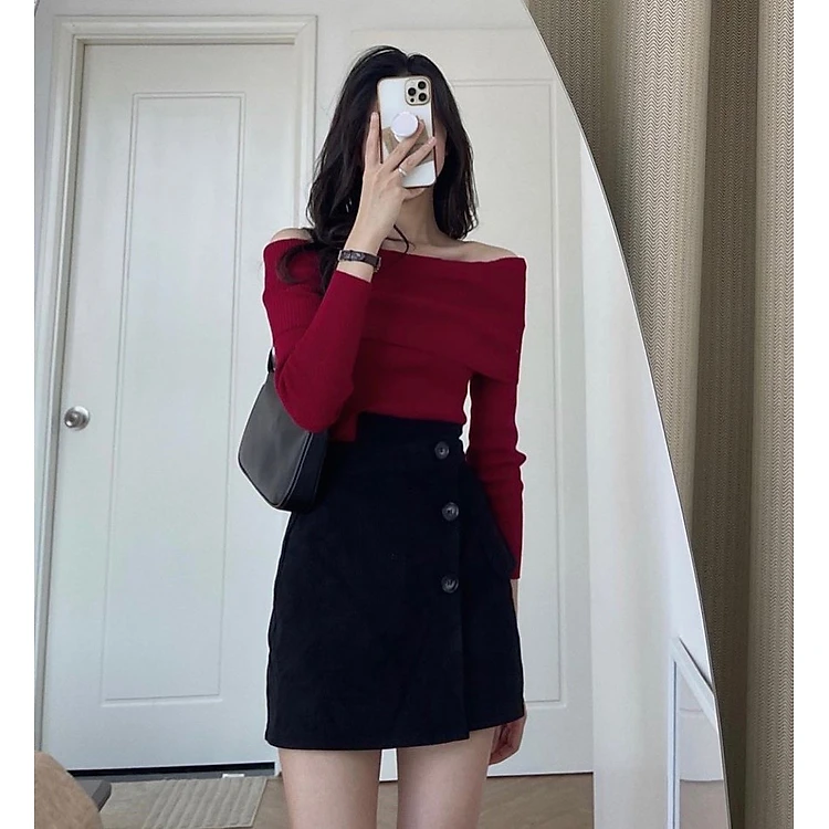 Set áo đỏ trễ vai tay dài kèm chân váy đen nút