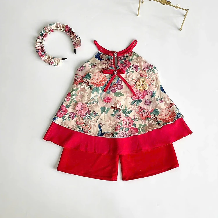 Set Áo Sát Nách Cổ Yếm Hoa Quần Lụa Kèm Cài Cho Bé Gái Sơ Sinh 1 2 3 4 5 Tuổi Từ 3-18kg Dành Cho Bé Gái