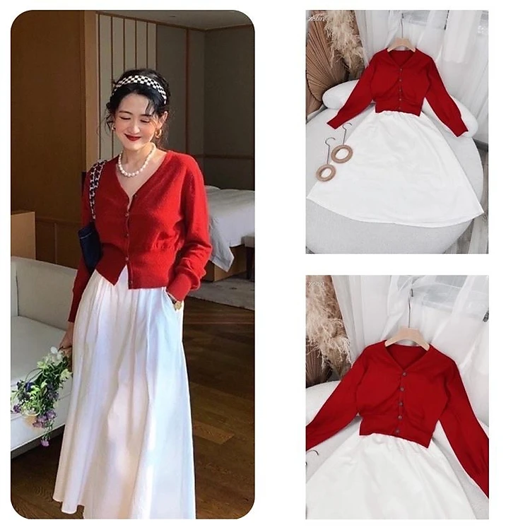 - Tên sản phẩm: Set áo cổ tim màu đỏ chân váy trắng xinh diện Tết, dự tiệc, đi chơi.