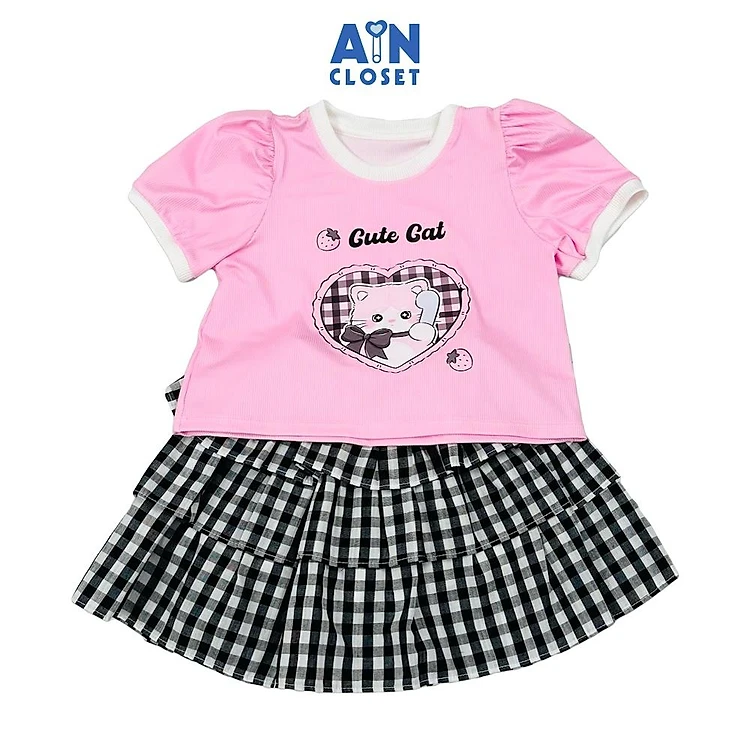 Set Áo Váy bé gái họa tiết Caro Mèo Đen Cotton - AICDBGPG4GTX - AIN Closet