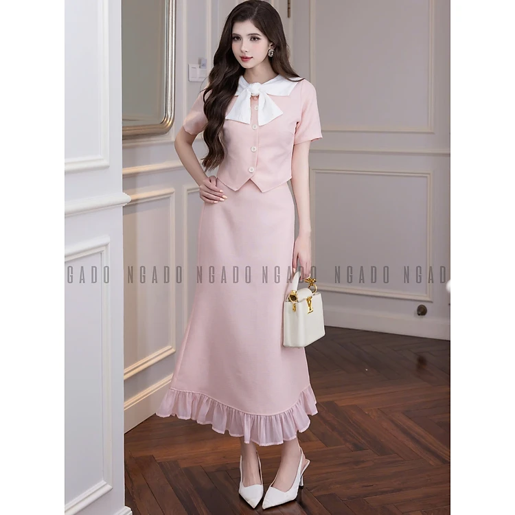 Set áo váy hồng cổ nơ trắng NGADO , set áo váy Nữ , set dự tiệc , công sở