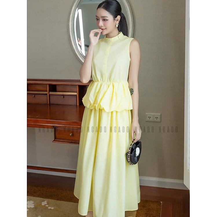 Set áo váy vàng cổ trụ NGADO , set áo váy dài , set công sở , dự tiệc