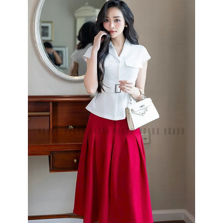 Set áo váy vest trắng đỏ NGADO , set áo váy vest , set công sở