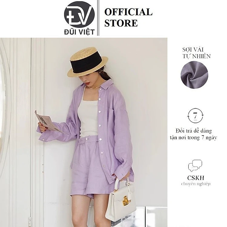 Set bộ áo sơ mi và quần short màu tím pastel nhẹ nhàng, dễ thương, phong cách Hàn Quốc, thích hợp đi chơi, đi làm, đi biển
