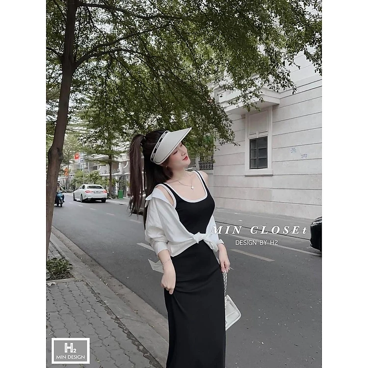 SET BỘ ĐI CHƠI, SET 2 MÓN VÁY MAXI CỔ TRÒN SÁT NÁCH PHỐI ÁO SƠ MI TAY DÀI CỰC XINH