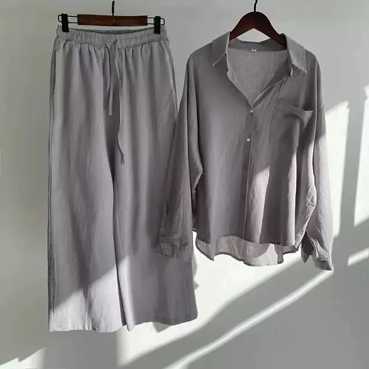 Set bộ linen gồm áo sơ mi nữ có túi và quần dài ống suông, phong cách nhẹ nhàng, tiểu thư, Hàn Quốc BV08