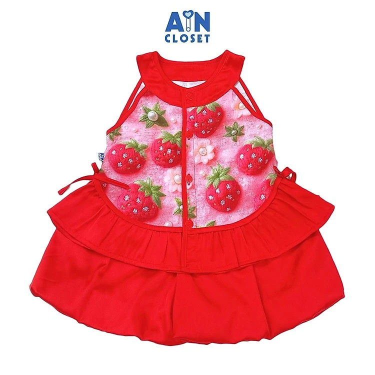 Set bộ quần áo Ngắn bé gái họa tiết Dâu 3D Lụa Đỏ cổ yếm - AICDBGXQH6LA - AIN Closet