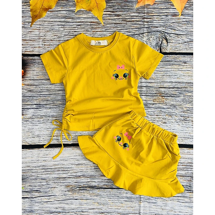 Sét chân váy kèm áo bé gái siêu cưng, chất thun cotton mềm mịn, áo cách điệu dây rút bên hồng, chân váy kèm quần chip bên trong cho bé thoải mái vận động.